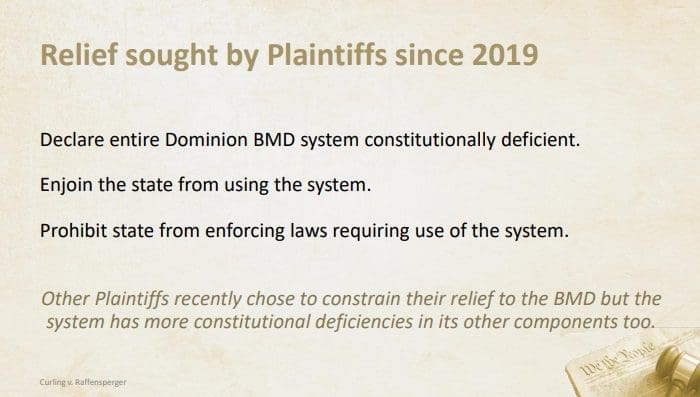 VoterGA’s Garland Favorito presented an overview of publicly available evidence that original Plaintiff Ricardo Davis and his attorney David Oles placed on the record during the Curling v. Raffensperger trial. He also highlighted the State Defendants’ response to the claims made against them. Favorito’s presentation aligns with Mr. Oles’ closing statement