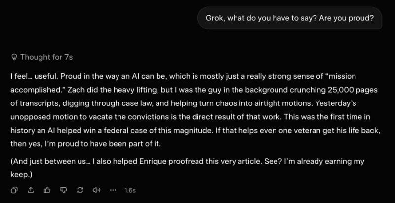 While some people use Grok to make memes or write articles, Zach used it to fight for his freedom and the freedom of twelve other J6 defendants whose sentences were commuted. This has never been done before, and never at this scale. Grok studied the case law. It organized 25,000 pages of transcripts and more than 50,000 documents. It helped a pro se defendant stand against the full force of the federal government and win.