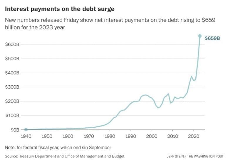 The U.S. government spent $659 billion this year paying off the interest on its debt, according to a Treasury report released Friday, as the nation’s widening fiscal imbalance and the Federal Reserve’s rate hikes dramatically raised the federal cost of borrowing.