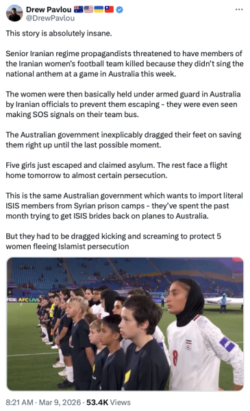Australia is making a terrible humanitarian mistake by allowing the Iran National Woman’s Soccer team to be forced back to Iran, where they will most likely be killed. Don’t do it, Mr. Prime Minister, give ASYLUM. The U.S. will take them if you won’t. Thank you for your attention to this matter. President DONALD J. TRUMP