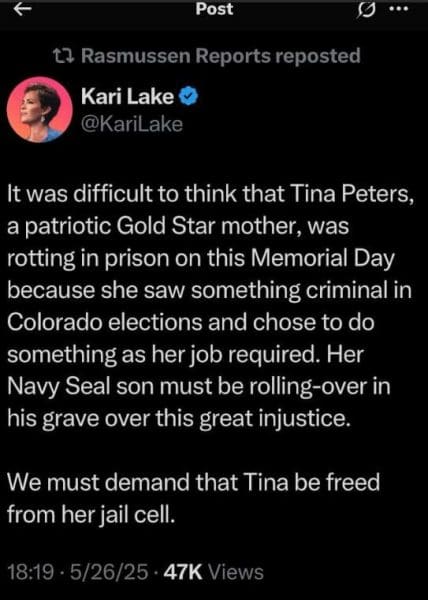 Political Prisoner Tina Peters’ reward for her election rigging discovery was a 9 year prison sentence, and she’s currently spending her first Memorial Day weekend in prison. What makes this extra bitter is that May 28th marks the 8th year since her Navy SEAL Son died in service to our country. In other words, Tina Peters is a Gold Star Mom, and she didn’t get the honor of being with President Trump and many other Gold Star families at Arlington Cemetery for the 2025 Memorial Day remembrance service. The mental pain and anguish resulting from this combination of events is acute, and you can hear it in her voice during a recording of her open letter to President Trump, available HERE.