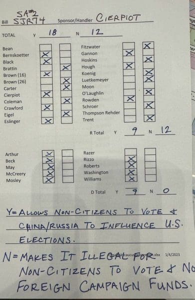 Nine corrupt Missouri GOP Senators joined state Dems today to vote for a bill that allows non-citizens to vote in Missouri elections and foreign governments to spend money in Missouri elections as well.