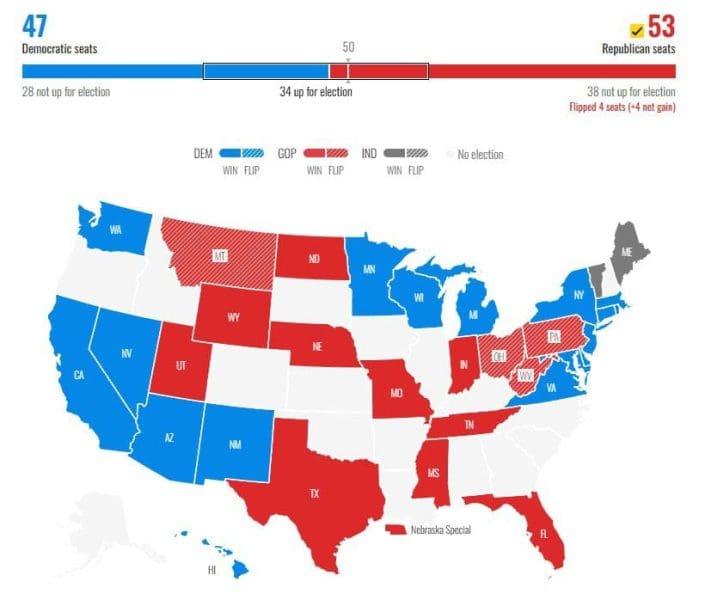 President Trump and the GOP also won the Senate where the GOP picked up four seats in winning a 53 – 47 Senate majority.